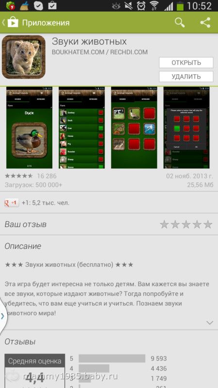 Учим с дочей животных и как они говорят. Есть музыкальная игруха, но как они там блеют и пищат — Похоже, но не то. Нашла классный апп для дочки Звуки животных. Выбор животных огромен, и главный плюс качественные картинки и сами звуки. Все просто, нажал — пищат/кричат/кукарекают. Ну и на русском языке. Если кому будет полезен, рада поделится ))