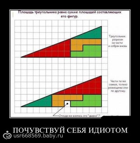 Не поленилась. Я разложила. Иначе бы не уснула ночью. Так и выходит, треугольники одинаковые, а клетка исчезает. Волшебство. Никакой логики. Муж говорит это необъяснимая математическая задача