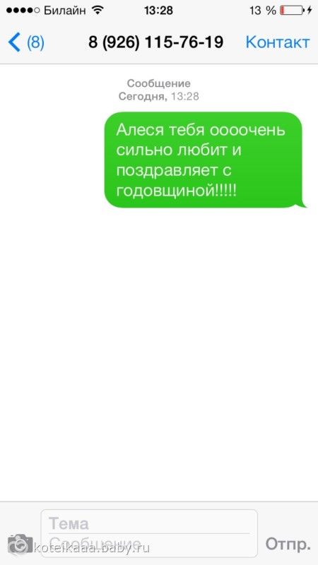 ***Девочки, прошу у вас помощи. Сегодня у нас с мужем первая годовщина свадьбы! Кому идея покажется глупой и не оригинальной — пожалуйста, мимо. У меня нет другой возможности поздравить любимого мужа, поэтому кому не сложно, отправьте пожалуйста ему на телефон смс со словами «Твоя жена тебя очень любит», «Алеся тебя очень любит и поздравляет с годовщиной» или что-то наподобие. Заранее спасибо откликнувшимся, это будет плюсик вам в карму))) Можно отправить через интернет, как вариант)