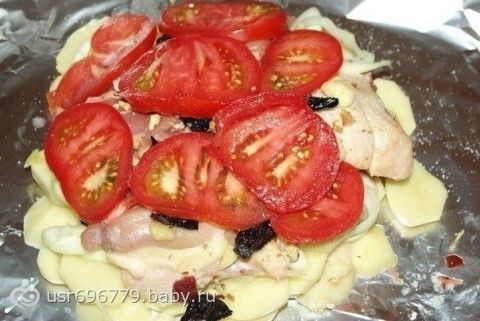 порезанный картофель, лук репчатый, порезанный кольцами, рубленный куриный окорочок, чеснок (мелкие кусочки), чернослив (мелкие кусочки), измельченные грецкие орехи, помидоры кружочками. Все посолить, поперчить.