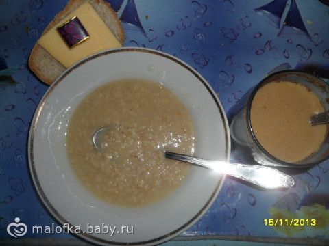 Завтрак: кашка с медом, бутик с сыром, долька шоколада и кофе с молоком и корицей