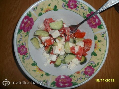 Ужин: салатик из помидора, огурца и сыра фета, с оливковым маслом