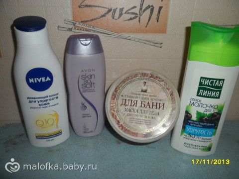 Слева направо: лосьон для упругости кожи от нивеи, лосьон для упругости кожи от эйвон, маска для упругости кожи для бани, и молочко для упругости кожи от чистой линии