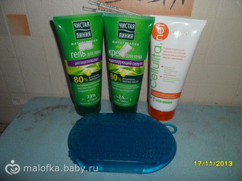 гель и крем от чистой линии и крем от маграв (типа разогревающий, но я ничего не почувствовала совершенно), ну и массажная щетка, в последнее время редко использую.