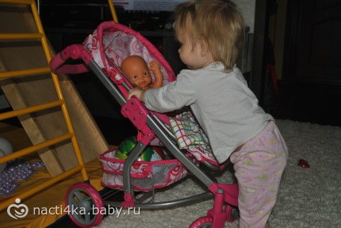 Стала очень при очень много играть с куклой и коляской прям качает ее, обнимает кормит-вообщем мамочка растет)))