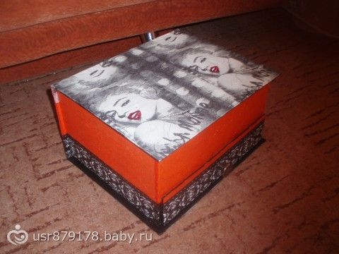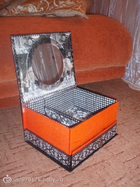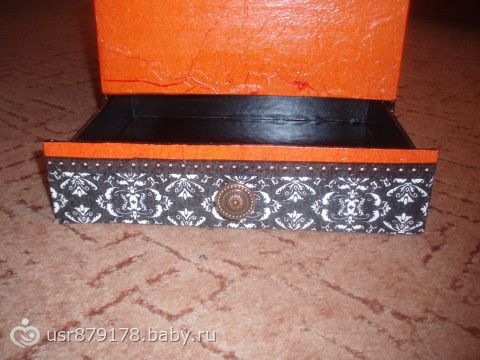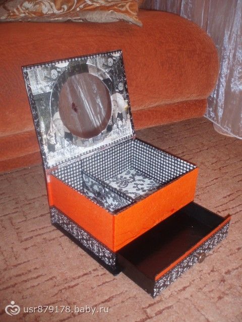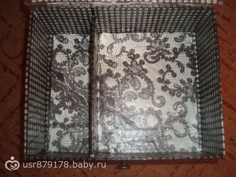 !!! там описывается принцип работы, а дальше в ход идет фантазия, я декорировала салфетками и сделала ящик!!! можно отделать тканью, можно сделать несколько ящиков или много отделений, смотря под чего планируется преспособится шкатулка!!!