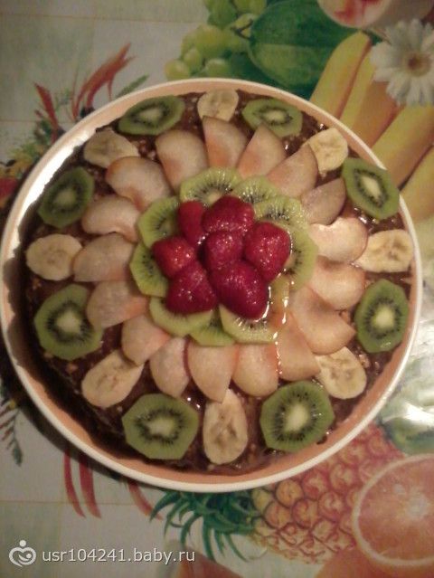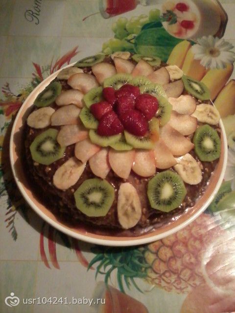 Залила торт глазурью, украсила фруктами отталкиваясь от своей фантазии и в холодильник на ночь, чтоб хорошенько пропитался...