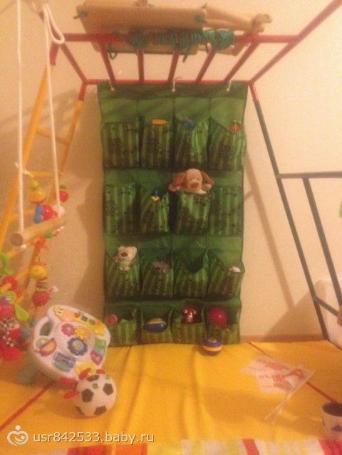 Девочки, может кому идея приглянется. Купила такую штучку, и в кармашки небольшие игрушки закинула. В планах еще подписать чтоб ориентироваться где что лежит. Теперь звери отдельно, мячики машинки, муз инструменты и т д. мне показалось вполне удобно.