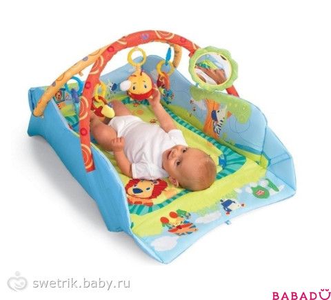 ОСОБЕННОСТИ: Бортики позволяют новорожденному чувствовать себя в безопасности. 8 игрушек могут быть прикреплены в различных местах коврика. Дополнительная подушечка удобного размера для ребенка. Яркая электронная панель 2 в 1 проигрывает 20 различных мелодий со световым сопровождением. 8 колечек для прикрепления игрушек к коврику. Игровое пространство «растет» вместе с малышом.