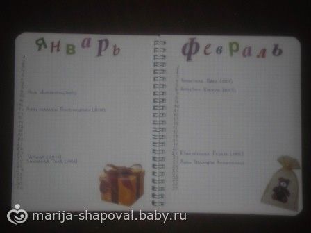 Занесите в календарь дни рождения членов семьи, близких людей, друзей и всех, кого вы хотели бы поздравить в течении года.Не забудьте также отметить важные годовщины или памятные даты, с которыми нужно будет поздравить родных и близких