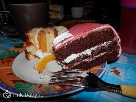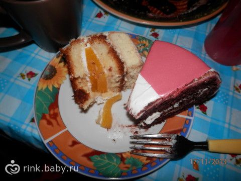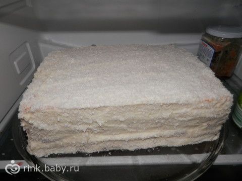 Простой бисквитный тоже, прослойка из персиков (в пюре их смолола и желе сделала) Коржи пропитала сиропом от персиков, сливками обмазала и сверху кокос… Хотела красиво украсить сливками, так купила закрепитель другой, они наоборот жидкие стали((( пришлось так намазать, да кокосом засыпать… да никак не называется, я на кухне обычно импровизирую))