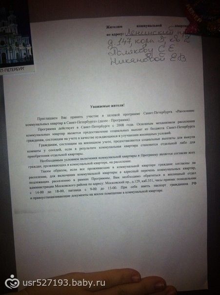 у нас московский район, ленинский 147 5-этажка хрущевка… на что свекровь подала заявление я не знаю, знаю только что на расселение… вот что мы получили.