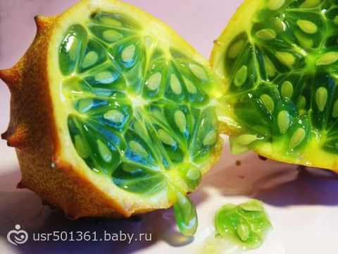Плод кивано жёлтого, оранжевого или красного цвета с несъедобной жёсткой кожистой кожурой, покрытой мягкими шипами. Имеет зелёную похожую на желе мякоть с бледно-зелёными семенами. По вкусу плод похож на огурец и банан. Может употребляться как в сладком так и солёном виде. В солёных салатах используется с солью и перцем в лимонном соке. Также используется во фруктовых и молочных коктейлях и фруктовых напитках. Содержит мало калорий, поэтому часто используется в диетическом питании и в диетах для снижения веса.