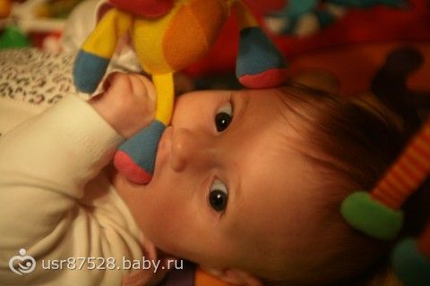 Нам сейчас 4,5 месяца, уже вылез один зубик, на днях ждем второй) Все еще мучаемся с нашим диатезом, пока что до сих пор сидим на гипоаллергенном Нане, кушаем его с ферментом, плюс постоянно мажем сыпь Бепантеном и увлажняющим кремом. Вроде получше, но я пока не оставляю мыслей перейти на козье. Из прикорма уже ввели гречневую кашку, цветную капусту, кабачок, яблоко и грушу. С яблоком вообще беда — пюрешка кислая, Женька не хочет ее есть.