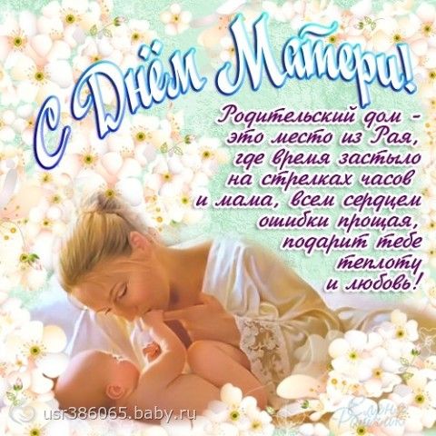 Мамин день — праздник, к которому никто не может остаться равнодушным!!! В этот день хочется сказать слова благодарности всем Матерям, которые дарят детям любовь, добро, нежность и ласку. Спасибо Вам!!! И пусть каждой из Вам почаще говорят теплые слова ваши любимые дети! Пусть на их лицах светится улыбка и радостные искорки сверкают в глазах, когда Вы вместе! )))))