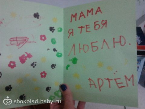 девочки, простите меня дуру грешную- не поздравила я вас вчера с праздником:) всех с днем мамочек:) крепких вам семей, здоровья деткам и вам, и чтобы детки вас слушались :) я вчера маму поздравила купила цветов, мой меня весь день не поздравлял, но я все таки выцыганила у него букет :))) Словами- ты меня даже не поздравил, где мой букет:)) ну это все в шутку, в итоге притащил орходеи,,,, мля я их не люблююю, ну ладн, пуст стоят:) Артем мне в пт притащил со школы открытку- 2 цветочка наклеено и внутри надпись- мама я тебя люблю Артем:) как милооо:-) я аж чуть ли не расплакалась:) видно что не сам помогали ему ну и ладно :)