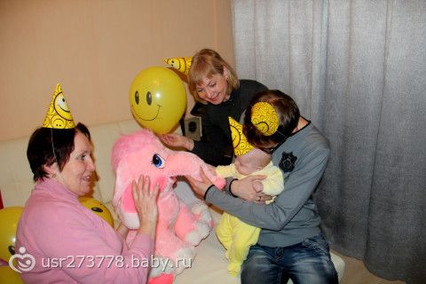 А наш папа притащил Лизе огромного слона!!! Просто у нас любовь к слонам появилась… стали замечать, что она начала реагировать на слоника, который нарисован на коробке Отривин Беби. Стоит показать ей его, так тут же рот до ушей!!! Причем на другое она так не реагирует, только на этого слона! Вот он и решил купить ей слоника, раз так нравится))))) Лиза была довольна, долго рассматривала его, щупала потом улыбнулась и ему))))