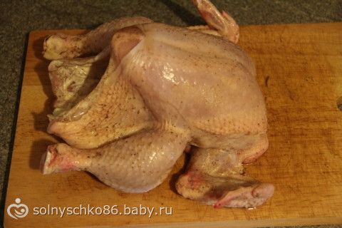 Взять небольшую курицу, срезать лишний жир, вымыть, обсушить салфеткой, посолить, поперчить.