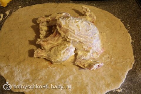 Раскатать тесто толщиной 0,5-1 см. В середину пласта — курицу, хорошо запечатать тестом, чтобы при выпечке сок не вытек.