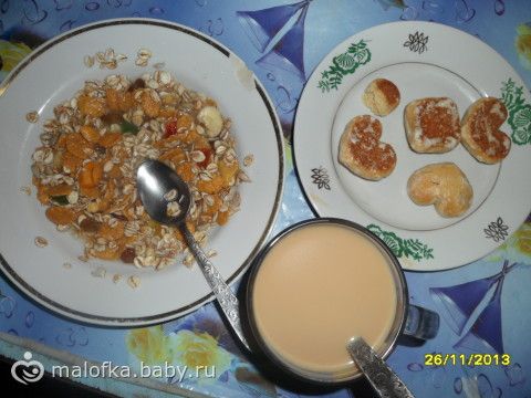 Завтрак: мюсли тропические (залила простой водой), прянички миндальные и кофе с молоком
