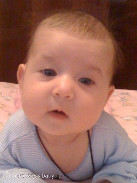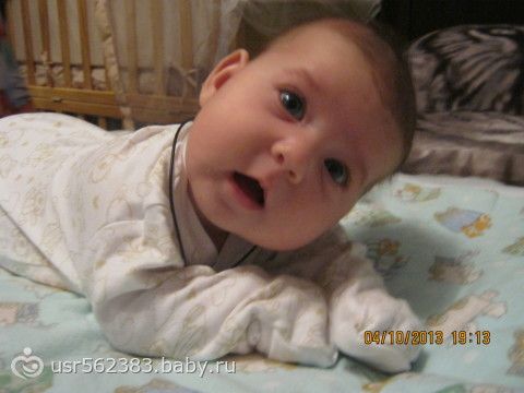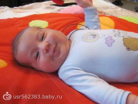 Здесь мы уже пробуем держать головку, правда немного ленимся, но у нас получается хотя еще нетвердо. Во так вот смешно у нас получается.