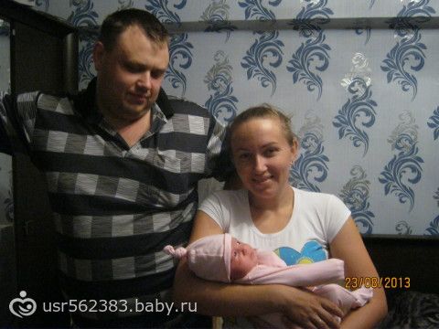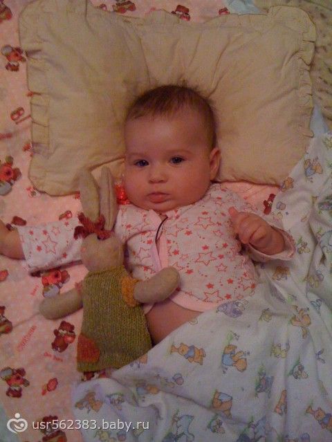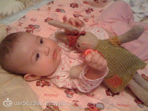 Здесь мы с нашей крестной Евгенией. Наша крестная в честь дня рождения дочи подарила ей прекрасного зайчика, с которым моя доченька спит и играет. Уже представляешь когда она начнет ходить будет везде носить этого зайченка.