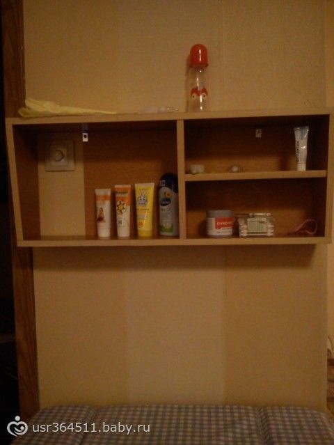 А пока мы с дочкой ходили в поликлинику, смастерил полочку над пеленальным столом, чтобы было куда ставить все эти крема и т.д. Вот она)