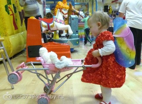 Конечно было много подарков доченьке — в основном разнообразные развивашки. Доче больше всего понравилась детская складная коляска-трость. Полвечера она возила в ней собачку по залу, а теперь дома рассекает с ней. Прям материнский инстинкт проснулся у малыши