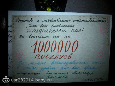 я вот такой чек на 1000000 поцелуев делала)) нужна только бумага, картон для самого чека и ручки цветные)) он был упакован в конвертик, мужу понравилось, он носил его во внутреннем кармане и когда мы ходили к примеру в магазин и он лез в карман за кошельком увидел чек и говорил ну что я еще не все поцелуи потратил?))) и так целовались до нашей теплой осени, пока он куртку не сменил)) а чек так в пуховике и лежит)) а еще как то раз спросил есть ли ограничения куда эти поцелуйчики предназначены))))до весны точнее теплой)))