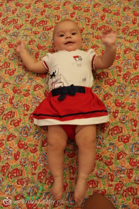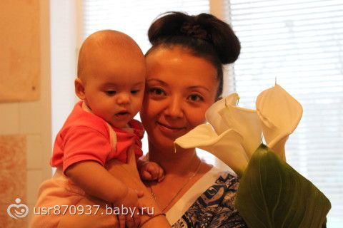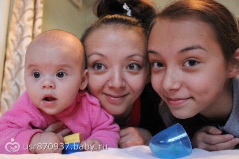 Выросли на 2 см, 67 см, и поправились на 500 гр 7950гр)))ползаем по пластунски очень быстро и везде проползаем, на четвереньках только два шага делает. В кормлении ничего нового не ввели, т.к. на тыкву была аллергическая реакция. Объем смеси, каши и овощей все тот же. Смеется и хохочет когда мы со старшей учим ползать на четвереньках))) Вылез один зуб в низу. Самое забавное, это когда Катя прижимается открытым ротиком к щеке и прижимается сильно-сильно — целует)))))Очень любит сестренку обнимать и играть с ней, думаю первое слово будет «Даяна»))))