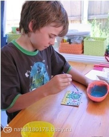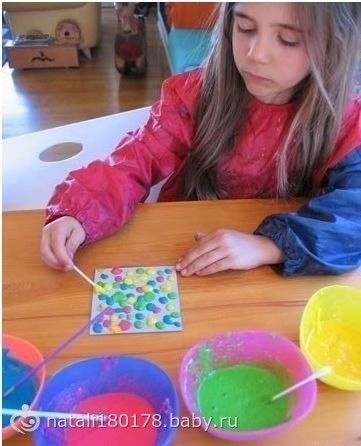 Наносить краску удобно на плотную бумагу или картон толстой кистью. Можно использовать вместо кисти ватные палочки.