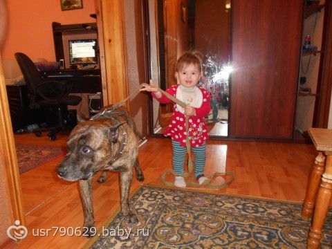 Утром ритуал — выхожу гулять собакина, пока одеваюсь — дочка должна подержаться за поводок. А вообще это банда — постоянно за мной ходят парой — Барс и Ника, собака мужественно терпит, когда Бульчик показывает где у него носик/глазки/ушки. Первые Никины слова по требованию — «Как собачка говорит?» В ответ она говорит: «ауууував, вав!» В точности копирует Барса.