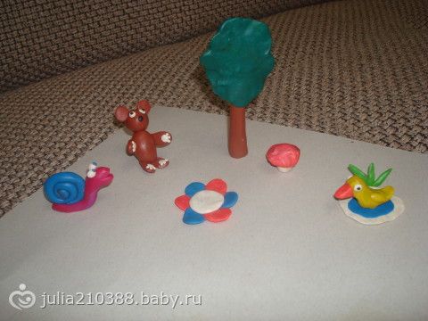 Да, это я лепила из пластилина. Доча спит, а я ей налеплю всего, она утром просыпается и радуется, когда много всего стоит у неё на столике) Она тоже лепить любит, начинает на рот зверюшкам налепливать кругленькие шарики — кормит их))