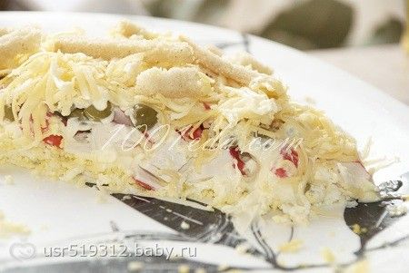 7. Слой тертого сыра немного полейте майонезом и посыпьте сухариками. Слоеный салат с крабовыми палочками и сухариками готов к употреблению!