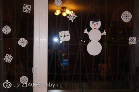 Сынишка мне помогал сначала вырезать — я вырезала снежинки, а он просто резал бумагу, а потом сам наклеил снеговику глазки, носик-морковку, ротик и шляпку, а мама уже поместила всё это дело на окно.