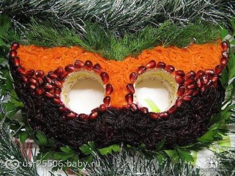 Занимаюсь поисками вкусненьких салатиков и закусок к новому году, вот делюсь… емли есть чем делитесь тоже. Салат «Новогодняя маска» Ингредиенты для салата «Новогодняя маска»: Куринная грудка весом – 300-350 грамм.Твердый сыр – 100 грамм.Одна средняя свекла.Одна средняя морковь.Для заправки: Пакет майонеза (200 мл).30 грамм порубленных орехов (грецких)Две дольки чеснокаПерец.Соль.Для украшения: гранат, укроп, петрушка.Способ приготовления салата «Новогодняя маска»: Курицу нарежьте на средние кусочки и отварите (после разрежете на более мелкие).Свеклу и морковь тщательно промойте, закиньте в кастрюльку с подсоленной водой и варите до готовности. После чего пусть остынут до комнатной температуры. Почистите и натрите их на средней терку, чтобы пальцы рук не окрасить помажьте их пере натиранием маслом, тогда сок не сможет впитаться в кожу.Приготовьте заправку, смешав необходимые ингредиенты, соль можете не добавлять, так как майонез уже имеет достаточно насыщенный вкус.Возьмите овальную тарелочку, поставьте две рюмки на расстоянии около пяти сантиметров друг от друга.Теперь в виде маски начните выкладывать слои из ингредиентов: Первый слой – кусочки куриного мяса.Второй слой – одну половинку заправки распределите равномерно по мясу.Третий слой – тертый сыр.Четвертый слой – остатки заправки.Пятый слой – наполовину тертая свекла и вторую половину выложите тертой морковью.Перед подачей украсьте зернами граната и зеленью, не забудьте вынуть рюмки.Приятного аппетита.