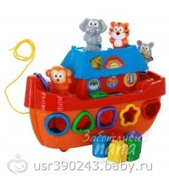 Ноев ковчег — это яркий кораблик с двумя палубами, спасательным кругом и штурвалом на колесиках. В ковчеге расположились: Ной — старичок с белой бородой, дикие и домашние животные — овца, лошадь, корова, свинья, лев, обезьяна, тигр, слоненок, жираф. Каждого зверька можно вынуть, а если вставить на правильное место, то зазвучит голос животного. Еще на ковчеге есть циферблат, у которого стрелки подвижны, маленькое пианино, при нажатии на кнопки они начинают светится и раздаются реалистичные звуки: скрип мачты, шум воды, звон корабельных склянок и колокольчика. Штурвал крутится. Игрушка привлекает внимание малыша и успокаивает его. Для работы ковчега требуются 2 батарейки АА. Для работы игрушки необходимы 2 батарейки типа АА. Размер игрушки ковчег — 34х20х20 см, Ной — высота 6, 5 см. Размер упаковки 41х21х21,5 см. Для детей от года.