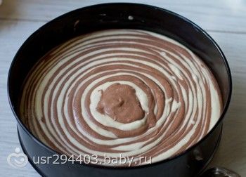 Начинаем выкладывать тесто в смазанную маслом форму. Сначала в центр формы кладем столовую ложку светлого теста, затем, сверху, ложку шоколадного. И так по очереди.
