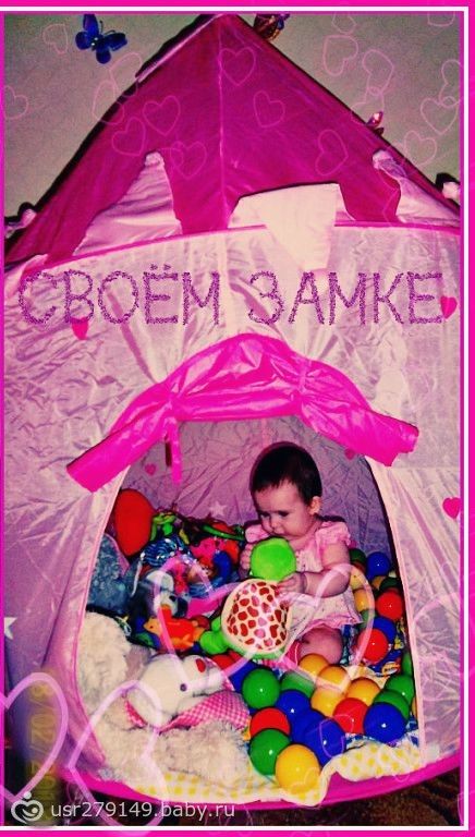 Доченька в восторге от своего нового домика. Выглядывает в окошки-сеточки. Я ей постелила развивающий коврик, она закидывает в домик игрушки, забирается сама и играется там с ними. Палатка-домик размерами 110см длиной, 60 см глубиной и 120 см высотой. Мы обе с доченькой в первую очередь туда забрались и сидели, хихикали, а папка нас «искал»