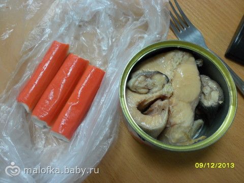 На перекус: горбуша (специально нашла такую, где жира всего 1,5 гр), и крабовые палочки (их в общем-то уже не хотелось, но пришлось доесть, чтоб не испортились)