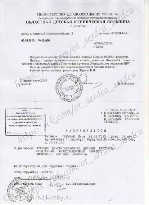Желанная беременность была большой радостью для семьи Гришман, с нетерпением ждали рождение маленького человечка — второй доченьки. Ничего не предвещало беды: беременность протекала нормально, УЗИ были без патологий, 24.04.2013 г. родилась крошечка Кира — все были безгранично счастливы! Через несколько дней маму с малышкой забрали домой. При выписке у Кирочки была желтушка, врачи сказали что скоро все пройдет. Но она не прошла, а начала усиливаться! Через две недели родители забили тревогу и маму с Кирой положили в областную детскую больницу. После обследования врачи огласили страшный диагноз: АТРЕЗИЯ ВНУТРЕННИХ ЖЕЛЧЕВЫВОДЯЩИХ ПРОТОКОВ. ВРОЖДЕННЫЙ ГИГАНТОКЛЕТОЧНЫЙ ГЕПАТИТ. Это было как страшный приговор — пришло в семью большое ГОРЕ… Врачи назначили лечение, малышка лежала под капельницами по 8-10 часов, маленькие ручки немели и были все синие! Появилась надежда на выздоровление, но врачи предупредили, что улучшение это временное. В клинике малышке сделали все что могли, теперь срочно нужна трансплантация печени. Учитывая состояние здоровья Киры, клиника Бельгии готова принять уже в середине января!