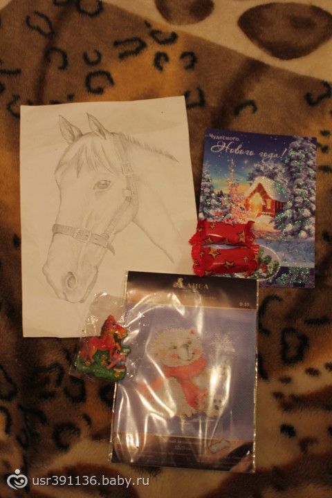 Подарочек — набор вышивки вызвал у меня умиление )) Такой хорошенький! Вот теперь знаю, чем буду заниматься на новогодних праздниках. )) Магнитик занял уже свое почетное место на холодильнике в центре — как никак символ наступающего года ))