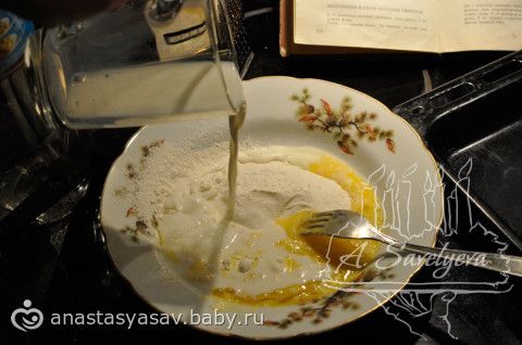 Делаем кляр: муку, молоко, яйцо и соль смешиваем до однородности