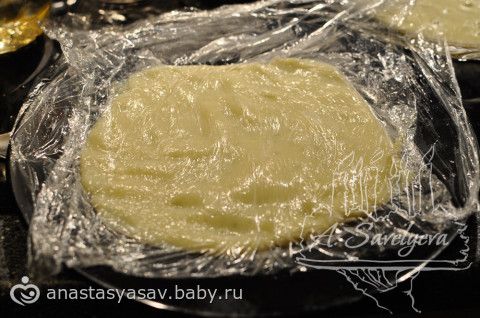 На другую тарелку кладем пищевую пленку, сверху эту ложку пюре и закрываем вторым кусочком пленки, расплющиваем потоньше (как на фото)