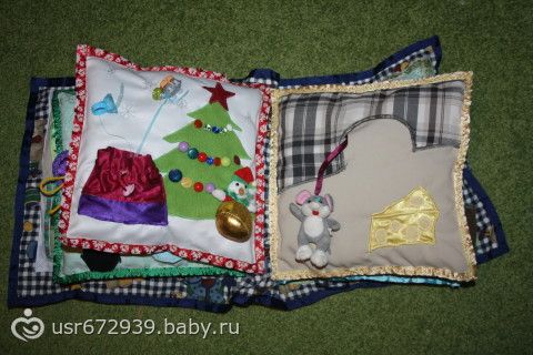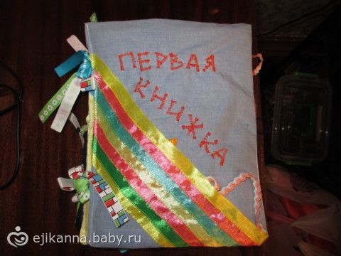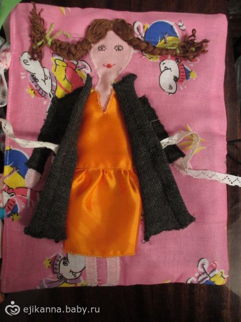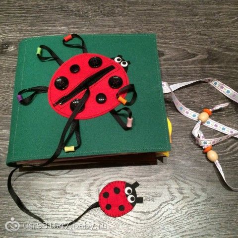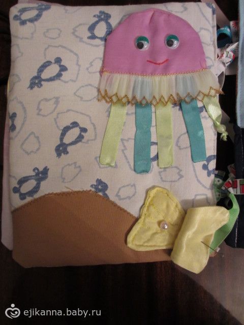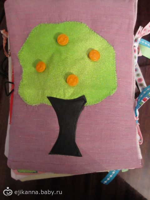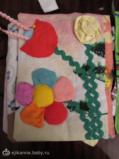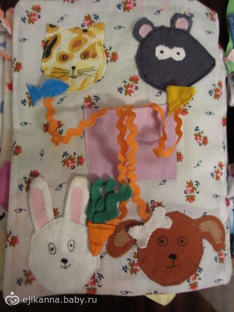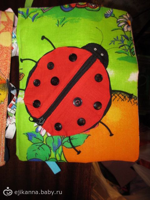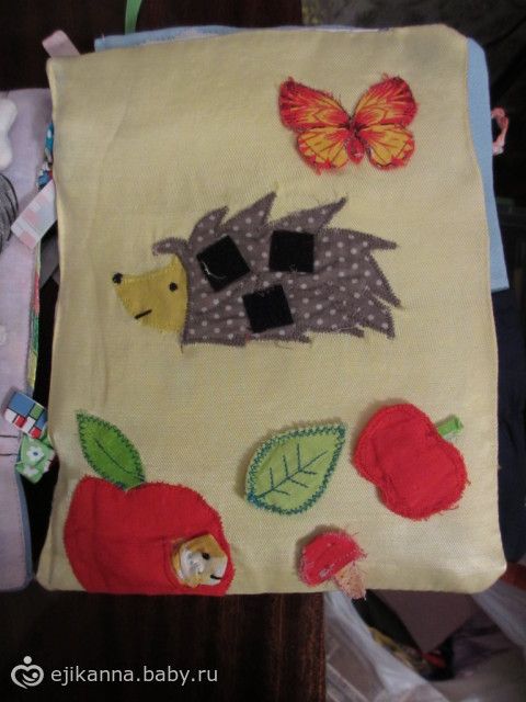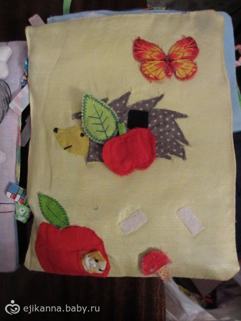 Я сшила, когда дочке было всего несколько месяцев, активно начала играть после года. Потом какое-то время книжка лежала без дела, а вот в 2 года дочка опять заинтересовалась — играет частенько
