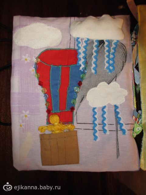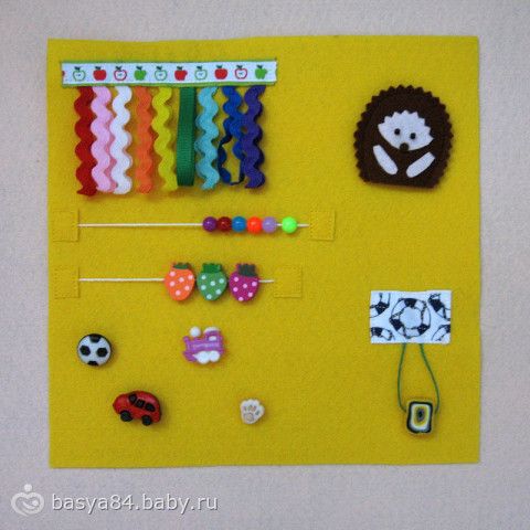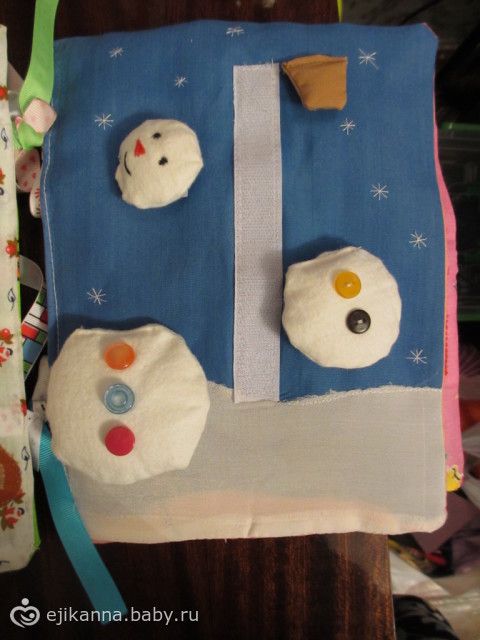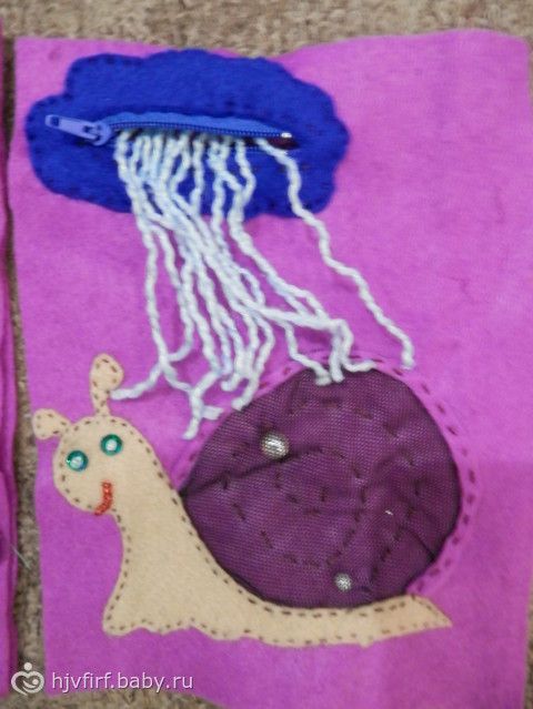 Сделайте страничку с кармашком или кошелечком на пуговице – пускай малыш учится застегивать и расстегивать его. В кармашек можно положить ключик на ниточке.