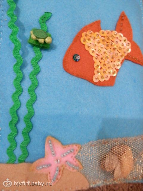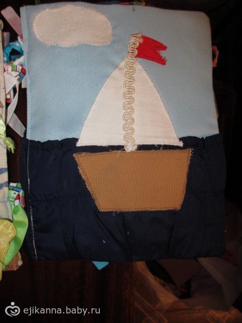 Страница 7 Море. Кораблик сделан в виде кармашка – можно «перевозить» любимые игрушки, двигается влево-вправо по атласной ленте на «горизонте моря». Море сделано в виде кармашка, в котором лежат рыбки – отдельно сшитые детали, 2 ракушки, в середине одной жемчужина – большая перламутровая бусина. Ракушка на кнопке.