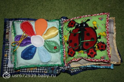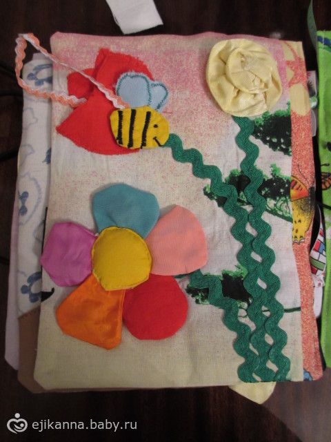 Здравствуйте, я тут новичок, и если что-то с ошибками, то прошу прощения заранее. Я занимаюсь изготовлением развивающих книжек и игрушек для детей разного возраста. Шью уже давно. Так как моя дочка к сожалению тяжело больна, я не могу выйти на работу, поэтому я занялась шитьем. Очень люблю детей, люблю с ними заниматься и придумывать для них различные развивашки. Много общаюсь с логопедами, дефектологами, которые мне советуют как правильно создать игрушку. Все вырученные средства я трачу только на реабилитацию дочери. Вашему внимаю хочу представить мягкую книжку из 6 станичек размером 15*15. Эта книга из серии «моя первая игрушка». Она на возраст от 6 месяцев. Легкая, функциональная, развивает базовые навыки ребенка. 1 страничка- солнышко, оно на магнитной кнопке (учимся стыковать), разные по тактильности лучики, бусинки в регелиновых трубочках и еще на страничке есть перебяжки. 2- радуга — учим цвета и перекатываем бусинки, можно их разложить по цветам радуги (учимся соотносить цвета), 3 страничка чудо-цветик. под каждым лепесточком спрятана пуговка соответствующего цвета, и если потянуть за шнурочек, то цветик сложится в бутон. 4 страничка — находим пчелку, которая пищит при нажатии и сажаем ее цветочек, который можно снять, 5 — пирамидка, учимся складывать и раскладывать, элементы на липучках. 6 страничка — лабиринт, передвигаем пуговку к определенной цели.