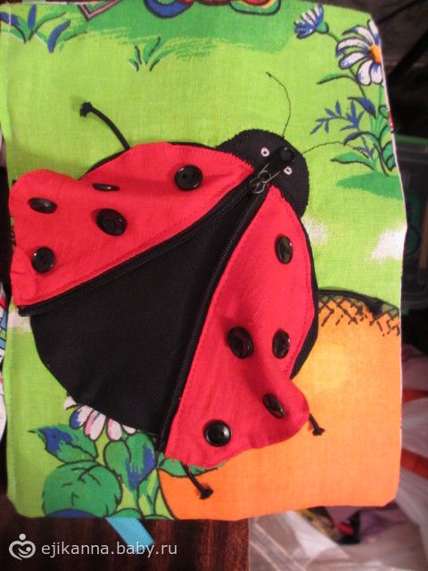Бабочка с объемными крыльями на липучках по краям и с разными квадратиками-угольниками; божья коровка – кармашек на молнии, можно что-то спрятать в нем.