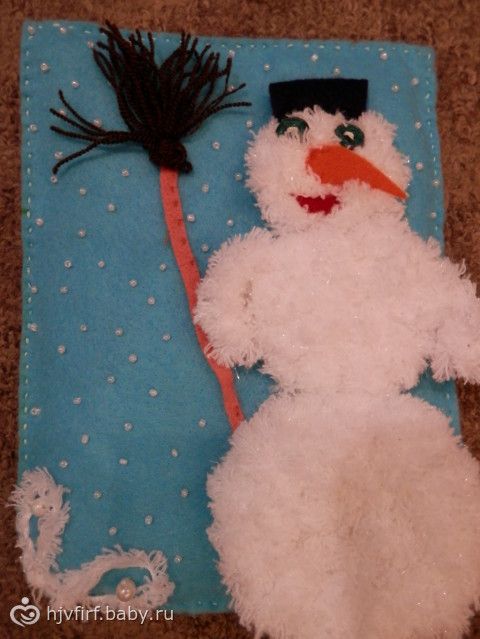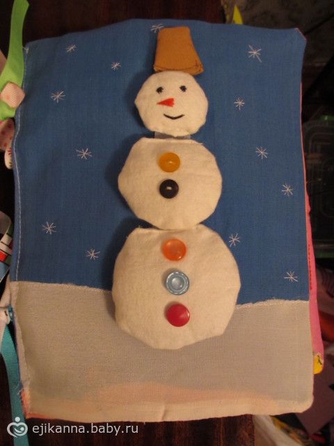 фото 5. Снеговик состоит из 3х вязанных пушистых частей (на липучке). Разобрав снеговика ребенку необходимо воостановить его занова. Метлу можно вложить в руку снеговика. По поверхности всего листа — «идет снег (бисер). Кроме того, в лист вшит целофан, благодаря чему страничка шуршащая (зима же =))
